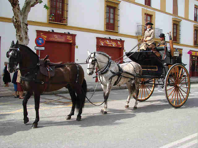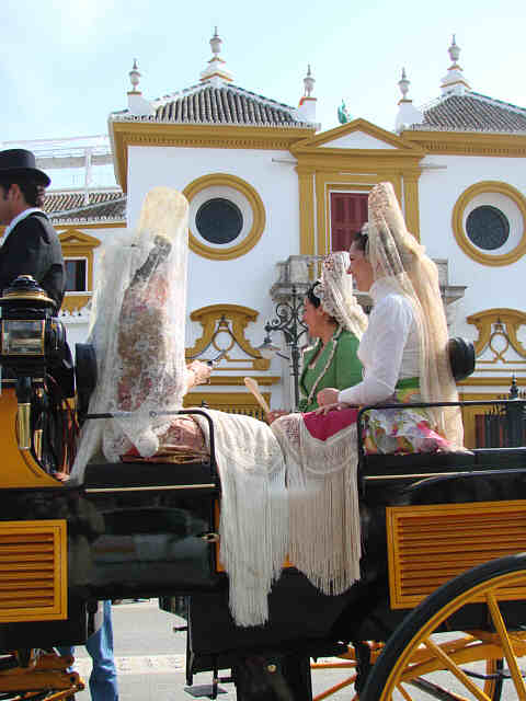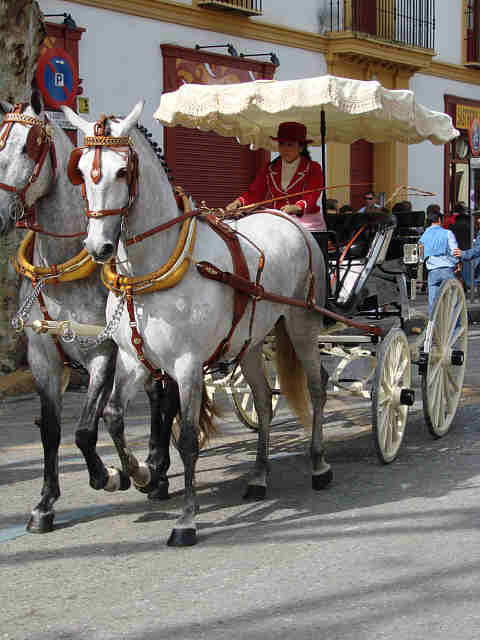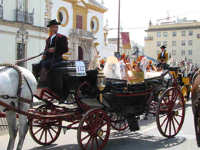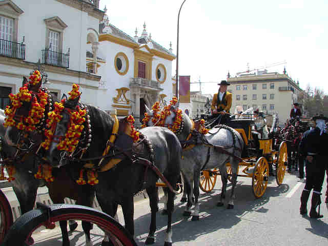 Para compensar tanta horteridad que nos hna implantado los obreros españoles en nombre de una falsa modernidad de atrezo;, de ridiculas setas, pieles (in)sensibles, de impresentables bancos y farolas de ocasión; trenes de juguetes, en compensación como decia mi amigo, ayer nuestros ojos vieron otra Sevilla, no una Sevilla del siglo XIX, como erradamente comentó alguien, sino una Sevilla del Siglo XXI, que tiene el bolsillo, el paladar, el tiempo, el buen gusto de presentar la magnificencia de la conjuncion de magnificos carruajes, caballos, guarniciones, como si lo acabaran de estrenar todo, con las hermosas guindas de este inmeso pastel de nuestra hermosas mujeres ; en un marco perfecto, en un dia perfecto , como heraldo de nuestra Feria.-