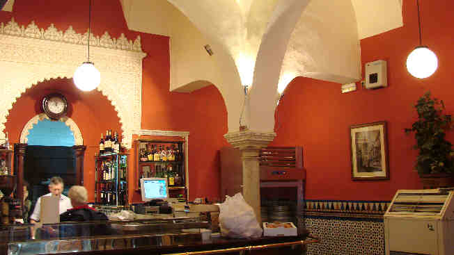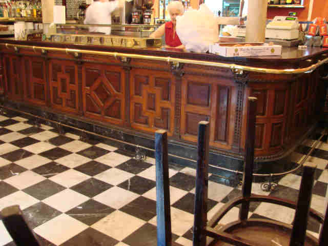 Cuantas personas habran piasado este ajedrezados suelo o apoyado en la barra de caoba , aguardando un cita o recuperandose de las calores con una fria caña y una deliciosa tapa , de este emblemático bar o sentado en uno de su veladores a la sombra de los naranjos de la calle Mateos Gago, que milagrosamente se han salvado de la indiscriminada talas tal del gusto de nuestro actual consistorio .-