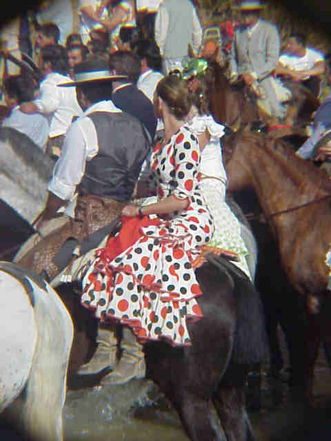 Como ven tanto las grupas como las amazonas ( le pueden retirara todos los puntos del carnet rociero si va de corto ) , llevan el traje recogido bajo la grupera o bajo la montura y como calzado olvidese, lo mejor son unos buenos botos , con unos calcetines largos ( cuidado con las llagas )