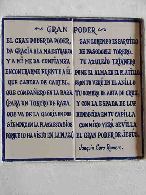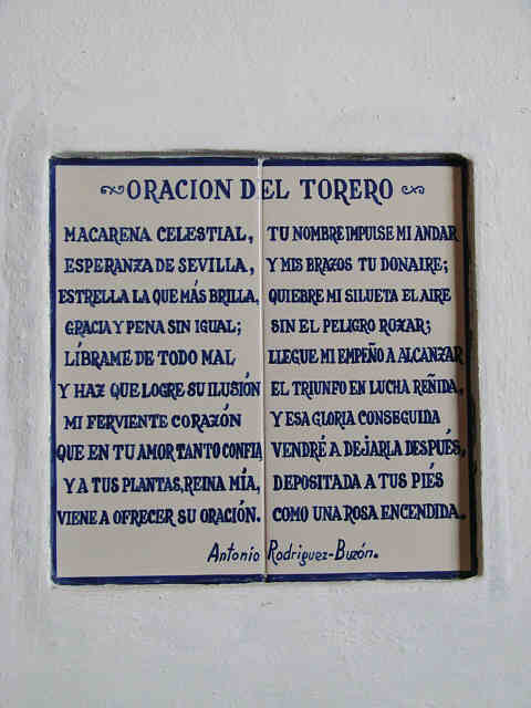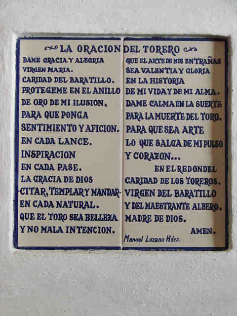 En la digamos antesala hay tres oraciones toreras en azulejos firmadas por Antonio Rodriguez Buzón dedicada a la Macarena; de Joaquin Caro Romero dedicado al Gran Poder y de Manuel Lozado Hernandez dedicado a la Caridad del Baratillo Patrona de la Asociación Benefica de la Vejez del Torero .-