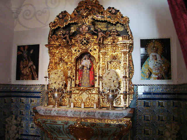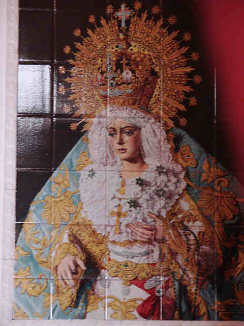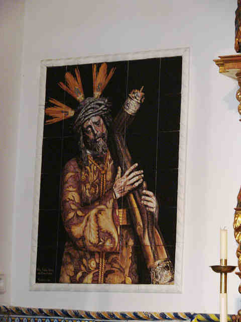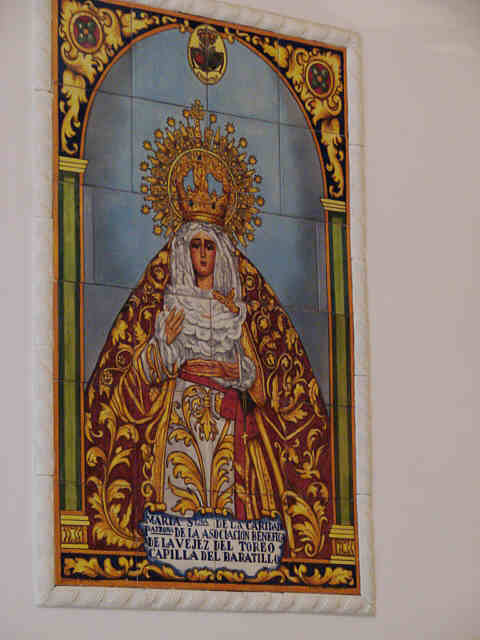 Como se puede observar a ambos lados del maravilloso retablo que está presidido por una imagen de la Virgen de los Dolores, atribuida a Juan de Astorga ; estan los azulejos dedicado al Señor de Sevilla y a la Madre de Dios y en la pared derecha segun se mira esta el azulejo de la Caridad del Baratillo.-