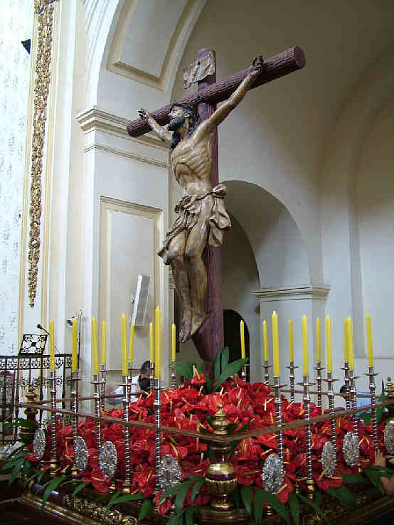 12+1 de FEBRERO de 2007 Este que aqui ven es el cachorro de Popayan en Colombia que procesiona cada Jueves Santos , en este su paso, no con trabajaderas, sino con parihuelas.- Fue esculpido en 1960 por el imaginero Asensio Lamiel, en los sotanos de la Embajada de Colombia en España, ya que habia sido encargo del entonces embajador Don Guillermo León Valencia que a la postre fue Presidente de Colombia .- No es que se parezca simplemente es idéntico y con el detalle de la corona de espinas . Observen la concepción tan curiosa de las andas procesionales, el exotismo de las flores, la iluminación mediante candelabros y todo enmarcado en una especie de pequeña barandilla .- El Cachorro trianero exportado no al otro lado del rio, sino al otra lado del charco Atlantico .- Si les interesa saber mas sobre la Semana Santa de Popayan Colombia vean hoy el programa de Popular TV La Chicota a las 23 horas VER TAMBIEN : LA
