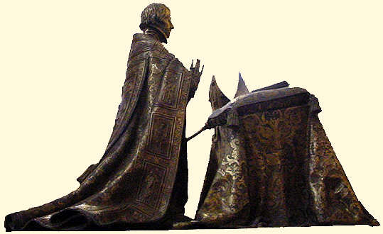 Pero el personaje histórico, tan bellamentre representado ,en actitud orante fue el arzobispo de Sevilla D. Cristobal de Rojas y Sandoval, que por cierto nació en Fuenterrabia ( Guipuzcua ) un 26 de Julio de 1502 a quien le debemos en otras cosas, el edificio del actual Archivo de Indias , entonces casa de la Lonja ya que con motivo de la visita de Felipe II a Sevilla en 1570, el arzobispo Cristóbal de Rojas hizo intervenir al monarca para que dispusiera de firma conjunta con el prior y cónsules de la Universidad de Mercaderes, la construcción de una Lonja en terrenos no lejanos a las gradas de la Catedral.y de esa manera evitar que las gradas catedralicias estuviera siempre invadida por mercaderes y tratantes , que incluso los dias de lluvia buscana cobijo en el interior del templo .-