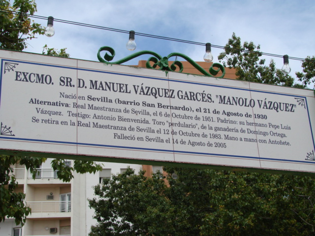 30 de Abril de 2007Por aquello que todos los santos tiene octava y ayer acabó la Feria y hoy es el afortunadamente desaparecido lunes de resaca , finalizamos hoy nuestros recorrido por todas las calles de la Feria, donde insisto tiene la oportunidad de leer las pequeñas fichas ceramicas de todos los histoicos toreros sevillanos que le dan nombre . -