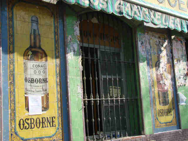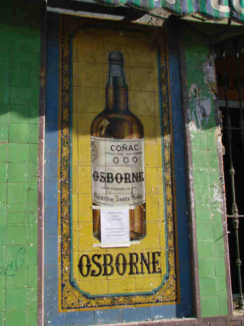 Tanto el impresionate zocal superior tapado parcialmente con un cartel chillón, como los cuatro botellas de las diferentes gamas de productos de Osborne ( dos de ellas enterrados en sedimentos publicitarios de carteles pegados ) , son de las obras mas antiguas de Menssaque Rodriguez y Compañia , en nuestra ciudad fechados en 1935 ., lo que los hace doblemente valiosos.-