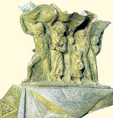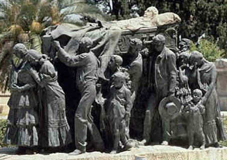 Hablando de Ignacio Sanchez Mejia, uno ve el grupo escultorio de la primera foto , los hombres, las mujeres los niños y salvando las abismales distancias artisticas, sufre una tremenda asociacion de ideas, pues se le viene uno a la cabeza el mausoleo a Joselito, donde el torero cantado por Garcia Lorca ( A las cinco de la tarde ) , aparece profeticamente portando el feretro de su cuñado , muerto por un toro y que esta descansando junto a él .- En el monumento superior portan una bandera ,