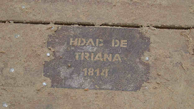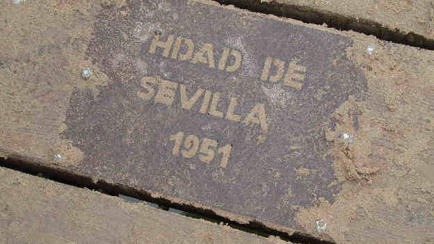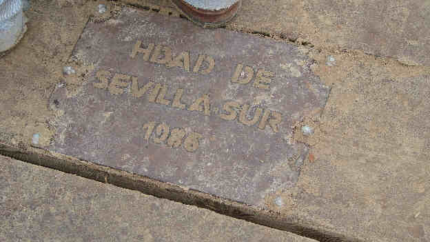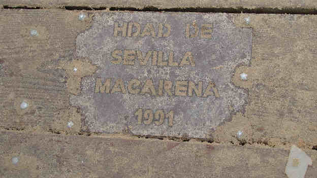 En cierta medida es complejo verlo, pues como comprenderan en estos dias de romeria el puente esta de bote en bote , amen de toda la arena que arrastran las carretas y los peregrinos, que lo cubren cada vez que lo cruzan . No obstante con un poco de paciencia, pidiendo por favor que se retiraran algunos/as de los que estaban encima y limpiandolo de arena, aqui les traigo esas placas conmemorativas , en los que a nuestras hermandades de Sevilla se refiere
