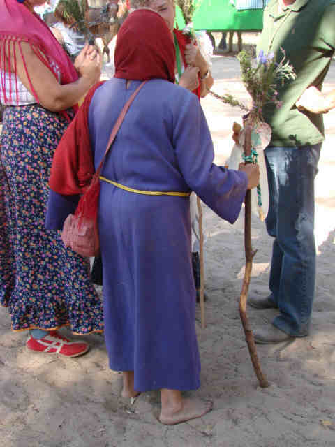 30 de Mayo de 2007 Dicen que la promesa mas dura para un rociero, es no ir al Rocio; no obstante uno se encuentra con cosas como esta , a la que no puedes permanecer indiferente y te hacen recapacitar .- En medio de esa sucesión de escenas de fundidos encadenados por el polvo del camino, de Simpecados de plata, caballistas, hermosas mujeres vestidas con sus batas rocieras, las palmas , el cante , el tambor, de pronto , aparece una peregrina andando por los caminos .¿ Que ira a perdile a la Virgen o que gracia tan grande le habrá concedido para hacer esto ?,ir andando y descalza a la ermita, teniendo por ayuda un palo .- Pero si se fijan, hay un segundo detalle devocional importante, su indumentaria , pues va vestida con la túnica y el cingulo del Gran Poder , Si le soy sincero hubo una época en que era, mas o menos facil encontrarse a hombres y mujeres con una camisa o un vestido del color de la túnica del Señor de Sevilla y el cingulo al cuello o a la cintura , pero hacia tiempo que no lo veia y no es menos sorprendente es volver a verlo , en mitad de la Raya Real .- La señora de la imagen , aunque suene poco cabelloroso, pero lo comento con admiración, no es precisamente una jovencita, lo que le hace doblemente meritorio su esfuerzo fisico , Si duda es un buen tapaboca a los detractores rocieros, que como dice la letra de la sevillanas "Hay quien dice que el Rocio es mentira y vanidad".- Esta imagen no la verán en ningún de los programa "tomateros" , que quizás este año lo han tendio mas crudo a la caza de famosos de primera division y famosillos de segunda, pues ha habido estruendosas ausencias, devolviendonos un Rocio sin rostros, un Rocio doinde la única protagonista es y debe ser siempre Aquella que esta en la ermita , donde el mejor sonido son los silenciosos pasos de esta señora , crunzado ardientes arenas, para al llegar al final de su peregrinación postrarse a las plantas de la Blanca Paloma , con el habito de su Hijo, El que Todo lo puede que como dijo alguien en un hermoso mesaje de fe rudimentaria , el Pastocillo lo mandó su Madre a estudiar a Sevilla y se hizo un hombre en San Lorenzo .- Ignoro si su doble promesa, era en rogativa o en acción de gracia, lo que no hay duda, es que estamos ante una prueba viviente de testimonio de fe y lo demás son tonterias .- Con un par .-