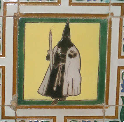 No se si recocordaran nuestros paseo por el Parque de Maria Luisa , donde descubriamos un Don Quijote cerámico y Nazarenos y Armaos en el parque , pues bien estos que ven aqui son primos hermanos , donde podemos observar una nazareno de la Esperanza de Triana con su cirio y todo , que no les quepa la menor duda ha sido testigo durante muchos años de reuniones y tertulias de sevillanos cofrades y noctambulos .-En este establecimiento existe una invento en lo que a medidas del sistema metrico decimal se refiere .-