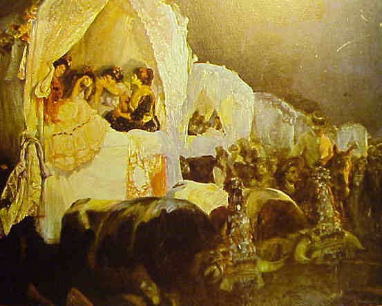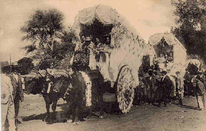 Gracias a las siempre generosas aportaciones de don Carlos Sainz de Vicuña, le adjunto la fotogrfía siguiente donde se puede apreciar , que las carretas y las señoras y/o/u señoritas que iban en ellas ofrecian todavia un aspecto mas idealizado aun, que el cuadro donde como siempre, la realidad supera a la ficción .-