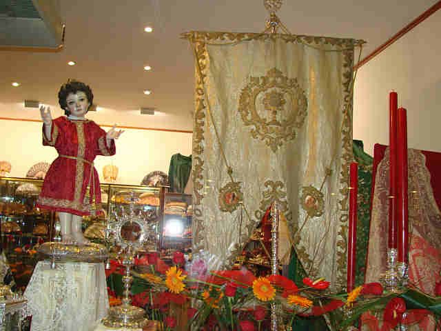 Asociación Madre de Dios del Sol en la calle CerrajeríaTres cuartos y mitad se podria decir de los escaparates y balcones , del llamado comercio tradicional y casas particulares, donde el Corpus se ha combertido en una "fiesta portesta" del descontento del sector comercial y de los habitantes del casco antiguo , hacia la politica municipal, que aunque haya que respetar el resultado de las urnas desgraciadamente han vuelto a salir lo mismo , para contibuar , el desmontaje , vulgarizacion, barbarizacion y acatetamiento de Sevilla .-
