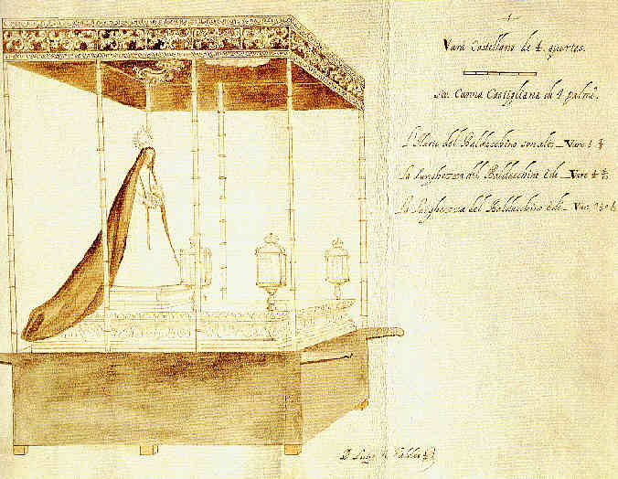 Lo que ven aqui arriba es el diseño de SU palio pintando nada mas ni nada menos que por Lucas Valdes ( cuyo cuadros esta colgados en nuestro Museo de Bellas Artes y Catedral Hispalense ) , fechados en 1661 y a pesar de la ingenuidad de sus trazos , con unas acotada medidas en varas castellanas en el lado derecho , practicamente sentó las bases con ligeras variaciones hasta nuestros dias, ; vararales, palio de cajon, peana, respiraderos, faldoses, maniquetas etc.-