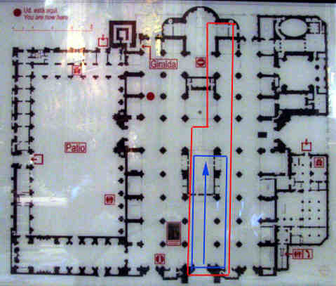 8 de Julio de 2007 Para que no se me despisten hoy vamos a recorren la nave central de la Catedral , nave de la Epistola - lado derecho - recorrido completo en rojo . Va desde la Puerta de la Anunciación hasta la Capilla de la Virgen de los Reyes .- Lo he divido en dos tramos en azul , uno en