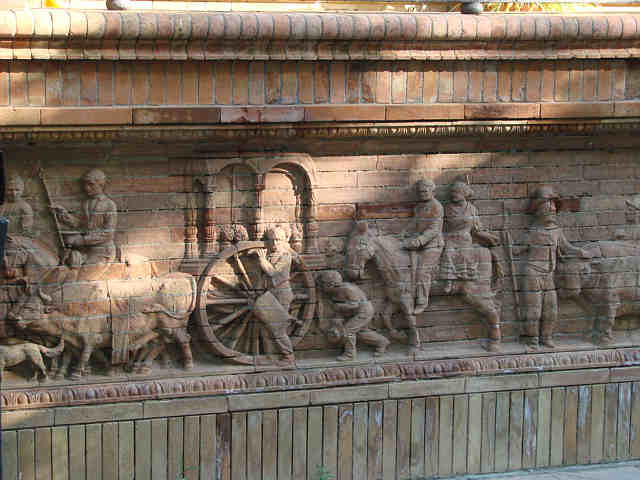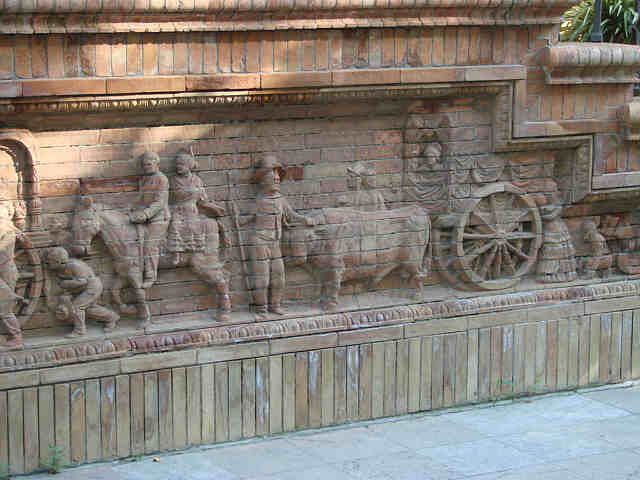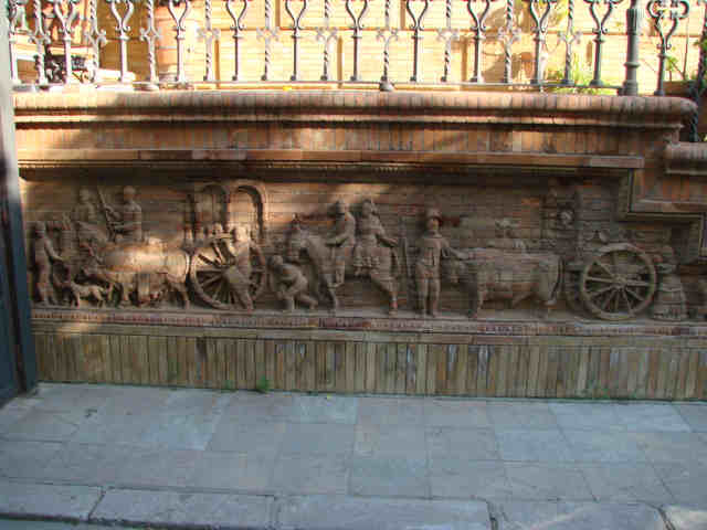 10 de Mayo de 2007En cualquier rincón Sevilla no nos deja de sorprender . Hay una señorial casa en Sevilla, donde en uno de sus zócalos de ladrillo visto se encuentra delicadamente labrado hasta el último detalle en altorrelive esta representacón de la Romeria del Rocio .-