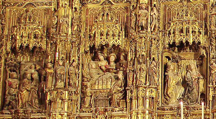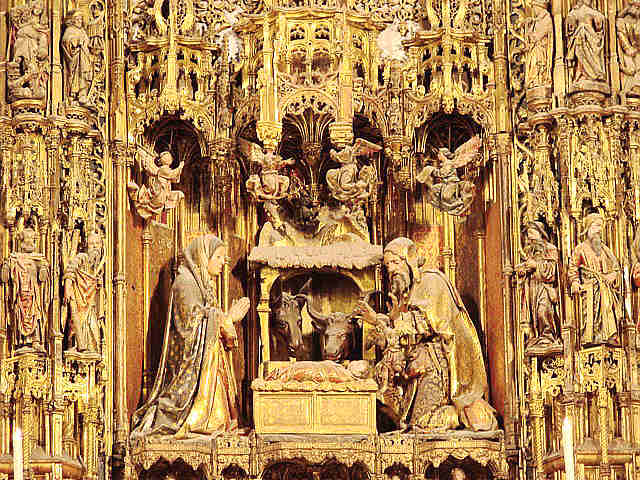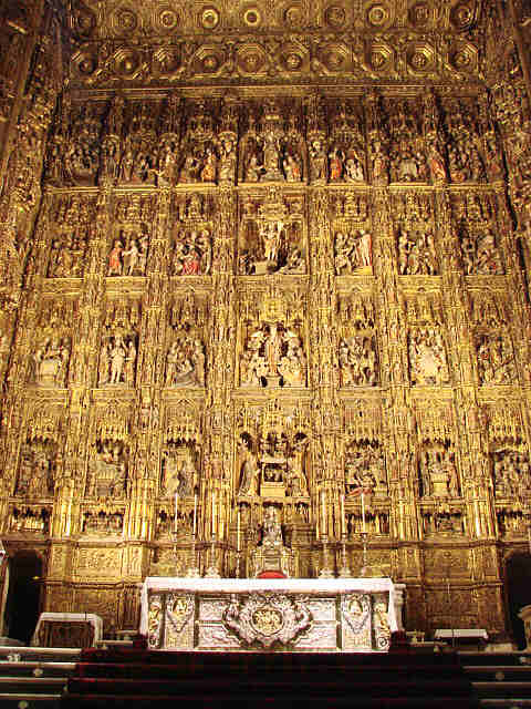 27 de Noviembre de 2007Antes de que usted se vaya al puente de la Concepcionista Constitución o la Constitución Inmaculada ; aqui ven el Retablo Mayor, de la Catedral de Sevilla el mas grande de la Cristiandad. Es obra que se realizó en sucesivas fases a lo largo de casi un siglo, comenzándose con trazas del escultor flamenco Pyeter Dancart, quien en 1482 consiguió un retablo de veinte metros de alto por dieciocho de ancho, con cuatro cuerpos de altura mas un banco, en horizontal y siete calles.-
