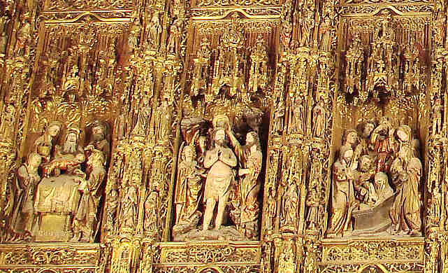 El retablo posee un conjunto de cuarenta y cuatro relieves y mas de doscientas figuras de santos que se disponen en las pilastras que articulan el retablo.
