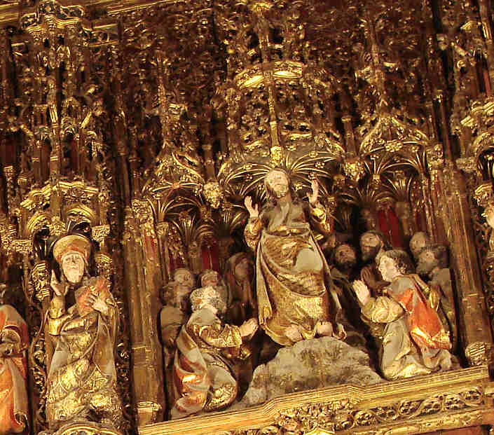 Sobre el dosel, configurado por casetones octogonales, se dispone una viga en cuyo centro figura una Piedad flanqueada por un apostolado, asi como un Calvario - VER RETABLO MAYOR DE LA CATEDRAL 2 -