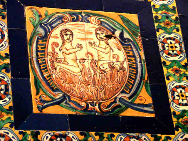 Mucho mas interesante es la decoración del zócalo de azulejeria trianera , con azulejos que versan sobre la dedicación de la capilla y donde se ven estos detalles monocrómaticos de las Almas entre las llamas, que con el frío que hay en San Lorenzo no esta del todo mal .-