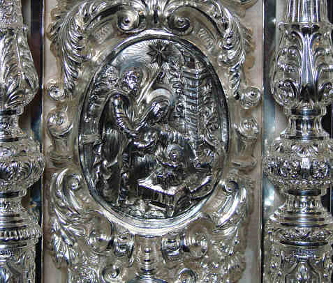 | HERMANDAD DE LAS CIGARRERAS Cartela del paso de Misterio donde se representa la Adoración de los Reyes Magos , obra de Navarro Arteaga , estrenada en 1998 .-