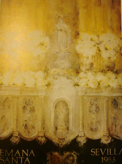 Queridos "pofesionales" de la información ( porque cobran a final de mes ) en 1983 el cartel oficial de Ayuntamiento ( que no del Consejo de HH y CC,), que anunciaba oficialmente nuestra Semana Santa ( que insisto anunciaban por separado nuestras Fiestas Primaverales ) lo pintó la laureada pintora sevillana Carmen Laffón ( no es por nada pero esto si que es un cartel ), representando la delantera del pasopalio de La Candelaria .- Pero es que voy mas allá ,esta impresionante obra , repito que fue el primer cartel oficial de nuestras Fiestas Mayores pintado por primera vez por una mujer, esta colgado en el Senado de España. representado a Sevilla .- Cierto periodista norteamericano tuvo la escatológica frase pero no por ello menso cierta de que "para cagar primero hay que comer" o lo que es lo mismo, oigan documentense un poquito, pues esto pertenece a una historia no muy lejana de nuestra cartelografia de Fiestas Mayores y para colmo de un cartel que fue un hito y esta en el palmares de reconocida obra de arte , realizado por PRIMERA vez por una pintora sevillana .- |