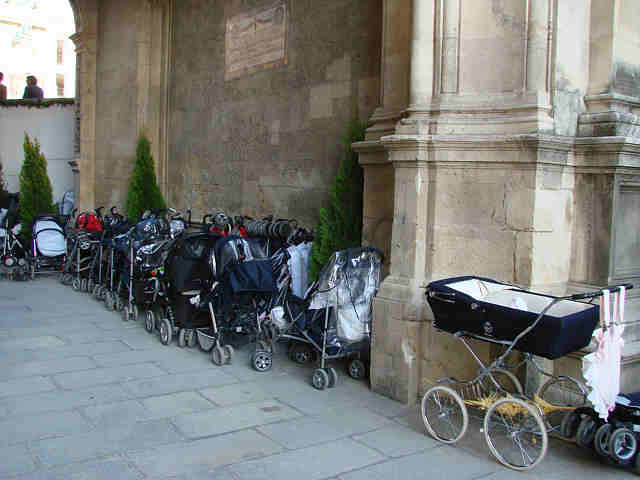 El problema es que los novatos Delegados de Fiestas Mayores que nos tocan en suerte ( o en mala suerte ) en Sevilla, vienen a inventarte lo que lleva mucho tiempo inventado , lo pueden ver en la foto , donde el Arquillo es el P-5 ( oído feriantes el autentico P-5 de la Feria ya no existe ) semanasantero de estos carros no de bebe sino de autentico carros de combate rodantes .- ¿Oigan le podrán matricula a los cochecitos de los bebe como hizo el señor Crespo a los coches de caballos ( iluminado por el Club de Enganche ) y de esa manera solo podrán ir un día los pares y otro los impares ?, ! que bien íbamos a estar como ahora en la desértica y desangelada "Feria tranquila " .¿ Habrá grua prenatal para los carros indebidamente aparcados fuera de la zona establecida ? ,. ¿ Se creará una zona azul ( o morada ) de aparcamiento con tickes cada dos horas ? . ¿Se realizaran pruebas de alcoholemia a sus conductores penalizandolos sin poder cagrejear cuando los niños sean mayores ?. ¿ En lugar de retirada de puntos de carnet, habra retirada de abono de sillas y palcos ?.- Aquí ven perfectamente estacionado los carros de combate en el que las mamas y papas portan a los niños en las bullas , que producen terribles y obligada penitencia , bien dañando tobillos, bien generando situaciones de angustia , que suele empezar con un alarmante . "!! Cuidado que llevo un niño !!" y suele acabar en un "A quien se le ocurre meterse aquí con un carrito".- Estas divisiones acorazadas , suelen iniciar su agrupación por lo general el Domingo de Ramos viendo la Pazporleparque, para después desplegarse hacia la salida de la Borriquita o dirección Alfalfa, alcanzo su máximo exponente , en las mareas humanas del Lunes y Martes Santos , de acompañantes de hermandades de largo recorrido .- Hay un tripulante de estos arietes mucho mas peligroso y desconsiderado que son las abuelas de los retoños que de una forma impía , crean una nueva teoría física de la impenetrabilidad de los cuerpos, donde arremete contra una muchedumbre y la atraviesa dejando a su paso una estela de jovencitas entaconadas con sandalias con los pies destrozados o señores cagandose en la madre que trajo al niño que sonrientemente viaja en dicho vehículo por lo general vestidos de nazarenito o costalerito de esta o aquella cofradía , ajeno a esta dramática situaciones .- !! Por un carril carrito de bebe ya !!, !! Por una matriculación de los mismo ya!!, !! Por un seguro de responsabilidad civil obligatorio para carritos !!, !! Prohibición de abuelas conductores de estos carros en Semana Santa !!.- Como verán , aquí vivimos en un permanente 28 de Diciembre día de los Inocentes, sin carrito.- |