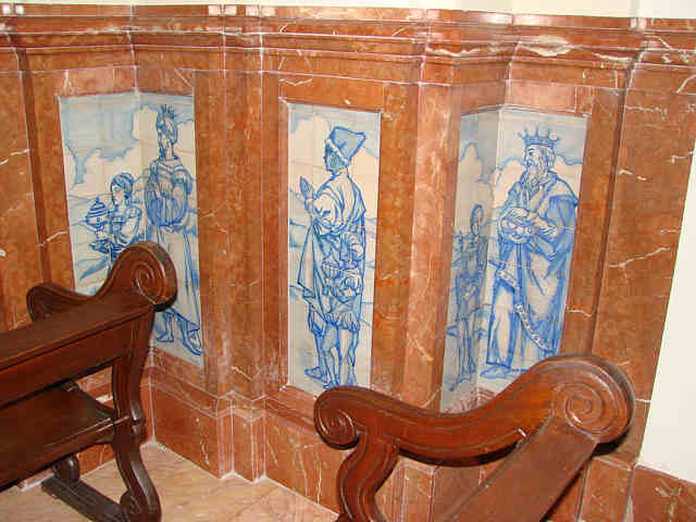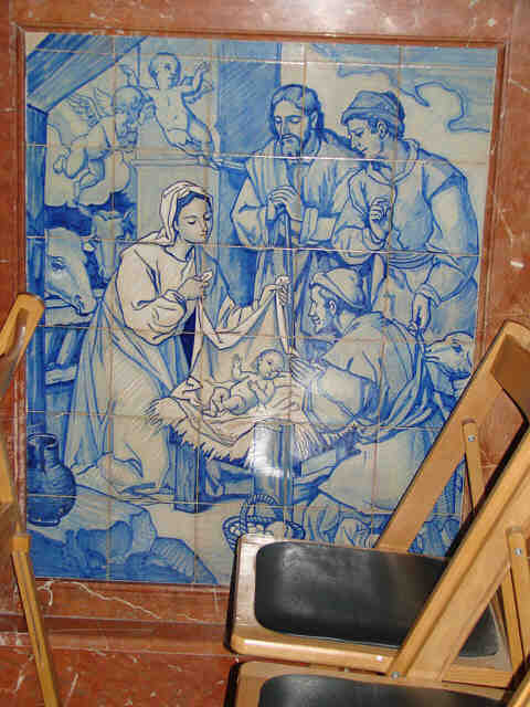 Este año les traigo no la Adoración de los Reyes sino dos Belenes completos y ademas estan juntos , uno se ve desde la calle y otro hay que entrar dentro del templo . Como puede ver son de una gran belleza monocromáticos en añil y en ambos dos se representa la Adoración de los Pastores, Los Reyes y la Huida a Egipto , todos pasaje de cualquier Nacimiento que se precie.-