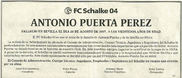 El FC Schalke 04 se une al dolor de la familia de Antonio Puerta y de la familia sevillista. La noticia de su fallecimiento ha