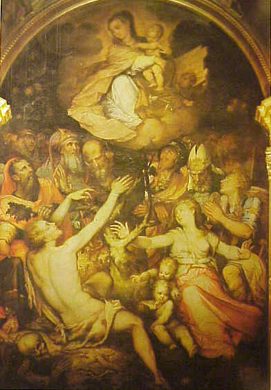 Sevilla 27 de Agosto 2007 Si me lo permiten les contare una pequeña historia píctorica y una simpatica curiosidad.- El paso dia 15 de Agosto en los prolegómenos de la procesión de la Virgen de los Reyes, la cCtedral, no solo estaba completamente iluminada , sino la llamada Puerta del Principe o de San Cristobal, que solo se abría para que entraran y salieran por ella, principes y reyes ( un servidor vio entrar por alli a The Queen , vease su Graciosa Majestad Isabel II de Inglaterra- con idependencia de que sea o no graciosa -en su visita a Sevilla ). Pues miren ustedes por donde, estaba abiertas de par en par y podia entrar y salir todo hijo de vecino , lo que favorecia notablemente la luz . Esos momentos hay que aprovecharlos.- Veran ,en la foto superior está el inconmensurable n fresco de San Cristobal obra de Mateo Pérez de Alesio o Alessio también Matteo de Lecce; nacio en Roma, 1547 , y no solo fue discipulo del mismismo Miguel Angel, sino que hay frescos suyos en la Capilla Sixtina , En 1589 viene a Sevilla y pinto el meritado fresco.- Próximo al mismo, en la Capilla de la Concepcion