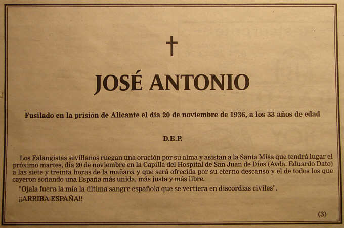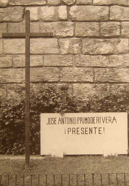 Confiemos que tras la placa o monolito de los rojos fusilados en las murallas de la Macarena, ( entre ellos mineros de Alnazcollar que venia con la democrática y sana intención de volar lo que pudieran de Sevilla ) por aquello de la recuperación TOTAL de la memoria histórica se reponga la primera Cruz de los Caídos en España , curiosamente la única que no se puso junto a ninguna Catedral o Iglesia sino en la murallas del Alcázar ,el 18 de Julio de 1937, no se había cumplido ni un año de su muerte y allí estuvo hasta el 1 de Diciembre de 1984 ( hagan la cuenta ).- Mientras tanto el pensamiento de la España soñada por Jose Antonio Primo de Rivera , Márquez de Estella ( bendita sea el basto desconocimiento de nuestra propia historia por los rojos , empeñados en borrar lo que desconocen ) estará siempre !! PRESENTE !!., porque en la actual Ex-paña mas que volver amanecer , empieza a oscurecer a paso agigantados .- !!! ARRIBA ESPAÑA