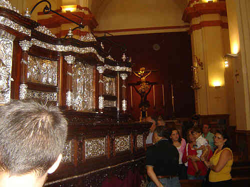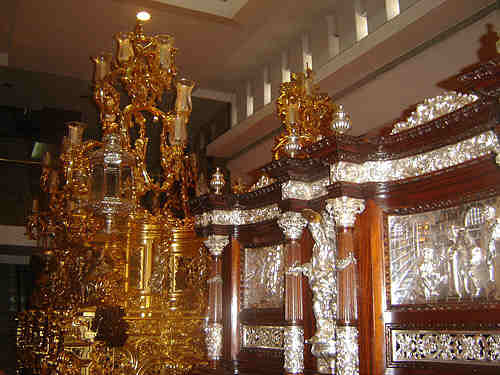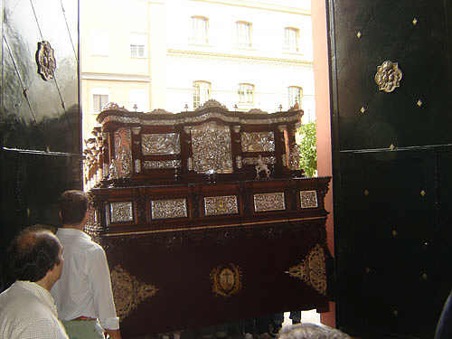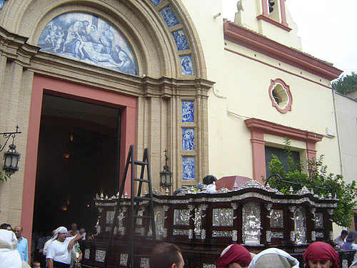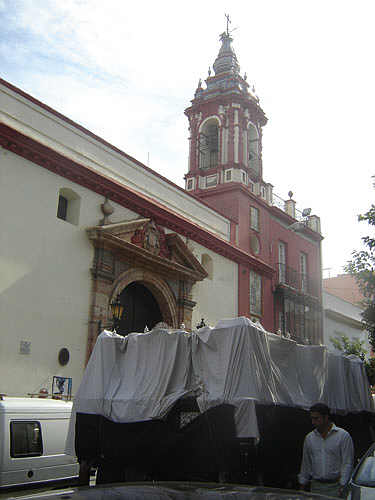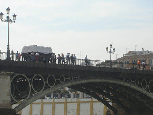 7 de Octubre de 2007 JULIO DOMINGUEZ ARJONA Ayer se pudo ver esta imagen curiosa del paso de la Hermandad de la Soledad de San Buenaventura , traslandandose a hombro de su cuadrilla de costaleros desde su almacén, sito en el casco historico , hasta El Cachorro donde quedará provisionalemnte expuesto en su sala expositiva de la hermandad trianera , por mor de las obras que se van a realizar en el meritado almacén .- Para los amantes de las curiosidades , les dejo estas instantaneas donde se puede ver el paso por lugares emblemáticos de Triana, asi como su entrada en la Iglesia del Stmo. Cristo de la Expiración.- Una casi jornada de Viernes Santos tarde , en domingo de otoño donde no faltaron ......ni la nubes .-