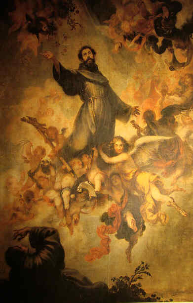 San Francisco no quiso ordenarse: sacerdote . Un día que Francisco oraba en el convento de Vicalvi (cerca del Monte Casino), se le apareció un ángel llevando en la mano una ampolla que contenía agua transparente: que le dijo "Mira, Francisco , así ha de ser quien desea dar a los hombres el cuerpo y la sangre de Cristo!" El Santo, en su humildad, pensó que no podría jamás alcanzar tan alta perfección y renunció al sacerdocio. Que digo yo que este angel se le deberia aparecer a mas de uno con la botellita .- Este pasaje queda plasmado en estas dos obras, tambien en el Museo , la superior de Juan de Valdés Leal de 1665 y la de abajo de Domingo Martinez de 1715 .-