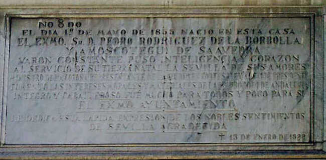 Es decir , la estatua que le falta al abandonado pedestal estaba dedicada al sevillano de pro, Pedro Rodríguez de la Borbolla Amozcótegui de Saavedra Abogado político y periodista, miembro del Partido Liberal, nacido en Sevilla en la casa donde esta la placa 1 de Mayo de 1855 y murió el 13 de Enero de 1922.