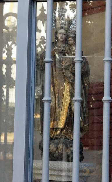 En 1731 había un retablo público pictórico dedicado a la Virgen del carmen en la calle Sierpes esquina con la calle Mozas . En 1816 la Virgen del Carmen que ven en las fotografías vino a sustituir el lienzo . Al derrivarse dicha casa la Imagen fue depositada en la capilla de San Jose . Al reconstruirse la casa se quiso volver a colocar el retablo carmelita con la oposición municipal .-