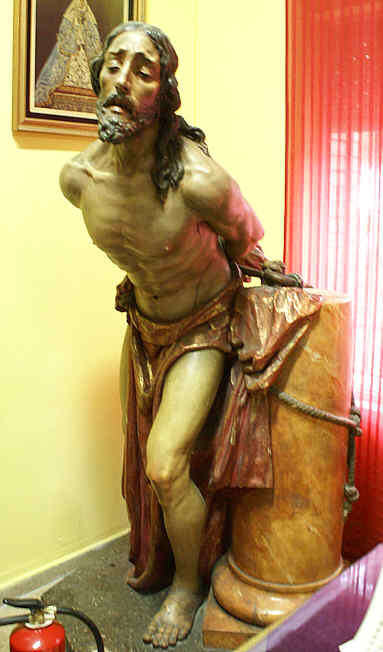 Ya en las dependencias de la Hermandad otra obra escultorica clave en la historia de esta Hermandad el Cristo de Joaquín Bilbao talló en 1916 y de 1 m 89 cm ( ese fueron todos sus problemas ) de un impresionante realismo pero desde el primer momento fue impíamente objeto del rechazo popular por su gigantismo . Procesiono entre 1916 y a 1937 donde fue sustituido por el anterior que vemos en la imagen . En 1973 volvió a salir pero solo sin misterio alguno .-