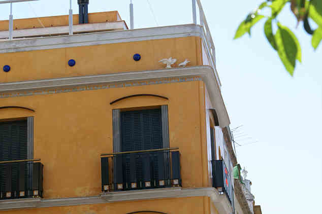 Alguien ha tenido la humorada de colocar dos palomas de escultura( ignoro el material ) en la cornisa del meritado edificio , para desconcierto del observador viandante y de sus propios alados congéneres , al ver como se han quedado tan tiesos, como mas de uno se va a quedar a final de año gracias a la política económica de ZP .-