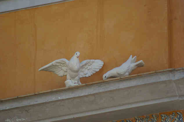 Justamente ne la esquina contraria hay una casa en cuya cornisa había posada dos palomas. Tras una larga hora de espera de una cofradía , el problema es que la palomas estaban mas quietas que en caballo de Feria de un retratista , por lo que dandole al zoom se encontró uno con esta sorpresa .-