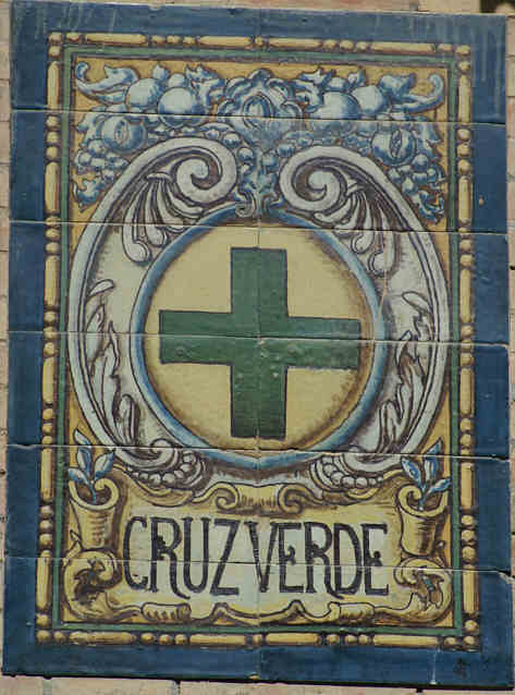 El azulejo superior esta exactamente en la esquina de la calle Feria ( anchalaferia ) y la calle Cruz Verde donde se encuentra el azulejo del mismo nombre , así conocido desde el siglo XVII , donde se encontraba ubicada una Cruz de Hierro pintada de verde , sobre un pedestal de ladrillo en medio de la calle, como tantas cruz que había en Sevilla y de la que hemos hablando en diversas ocasiones y que en su mayoría fueron empotradas en fachadas de Iglesias , mientras que esta tuvo otra suerte pues fue retirada en 1841 y acabo de remate de la torre de Santa Marina y allí sigue .-