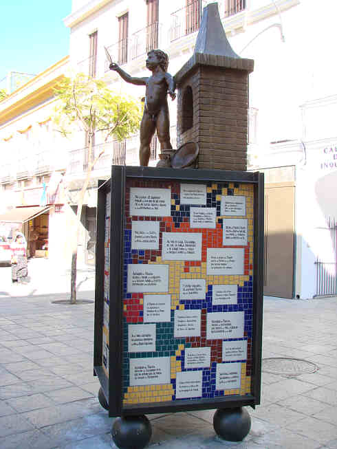 En cuanto al "monumento" propiamente dicho, en este caso no es la novia de Chuqui, como el que han puesto en la ex-plaza de la Pescadería y que hoy no se sabe muy bien lo que es, es un querubín escapado de algún paso de Misterio y no se sabe muy bien que es lo que representa , pues mas que un alfarero parece que anuncia una taquilla oficial de reventa de los toros , con una entrada en la mano .Estas cosas la hacen infinitamente mejor en Valencia y les pegan fuego. Aquí desgraciadamente nos la dejan para siempre .- Esta birria , nos la colocan en la calle San Jorge ( en trianero se pronuncia San Gorge, como el Cesá y el Gorge Cadaval ) cerca de una fachada que por si sola es un monumento a la cerámica trianera , en una ciudad donde esta el mayor museo cerámico al aire libre del mundo y que se llama Plaza de España i miren como la tiene de abandonada. ! Ole !.-