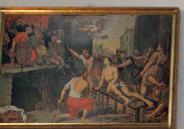 En sus paredes cuelgan ( a demasiada altura , carente de luz y que gritan por una restauración ) interesantes óleos entre lo que he de destacar los siguientes : El Martirio de San Lorenzo de mediados del XVII obra del pintor flamenco Pieter van Lint
