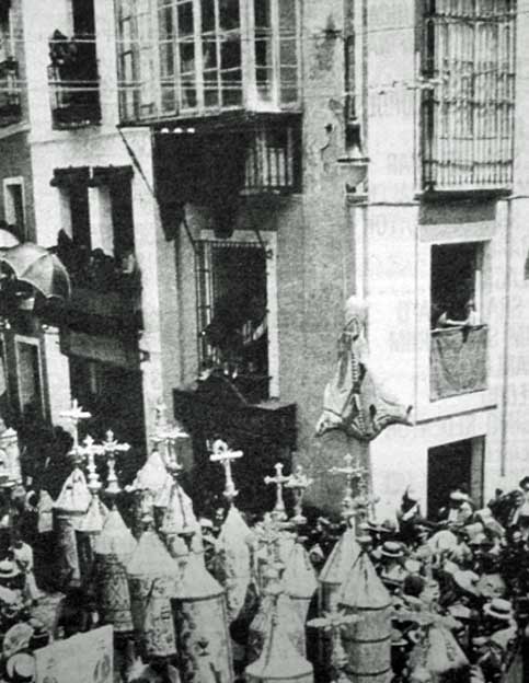 17 de Mayo de 2005 Verán,. hubo un tiempo en que las Cruces Parroquiales, estaba formada por una vara con la Cruz alzada estando adornada por una tela montada sobre unos aros y con figura de cilindro acabada en cono , llamando manguilla la parte por el todo .- Hubo en tiempo es que estas Cruces, procesionaban en el Corpus de Sevilla , como aquí lo vemos en los que era la Cuesta del Bacalao ( importante puerto de montaña en el itinerario de la cofradías , formado en la encrucijada de Alvarez Quintero, Conteros y Argote de Molina ) , así llamada por el bacalao que había en la esquina con Francos ( señores de la memoria histórica tranquilos, he dicho francosssss, de francos de pagar tributos los caballeros de a caballo fernandinos, no tiene nada que ver con el terrorífico Caudillo , no vayamos a liarla con los cambiazos de los nombres de las calles ) , hoy mas conocida como Cuesta de Robles , por los prósperos negocios de hostelería que allí se encuentra , propiedad de dicho señor.- En suma hubo un tiempo en que Sevilla era Sevilla