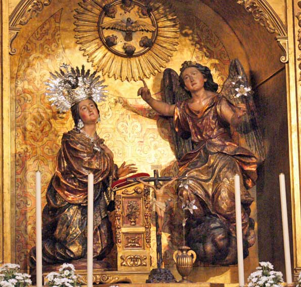 El retablo mayor tenemos el grupo escultórico de la Anunciación y a ambos lados San Juan Bautista y San Juan Evangelista y en el ático Santa Marta . Las esculturas son de Francisco Dionisio de Ribas