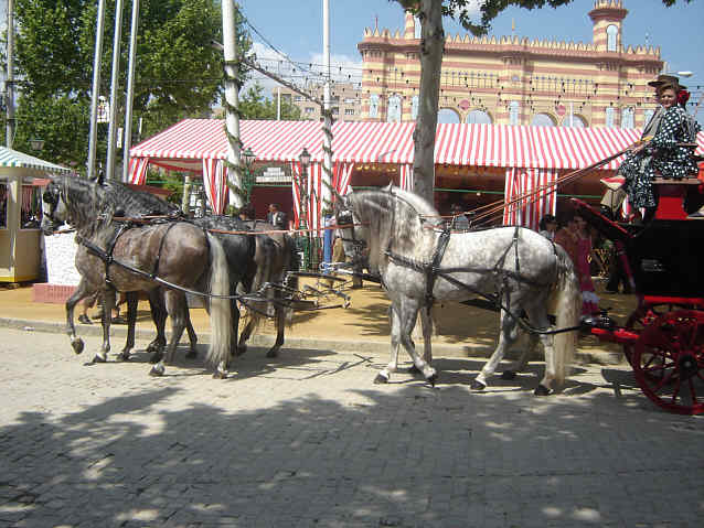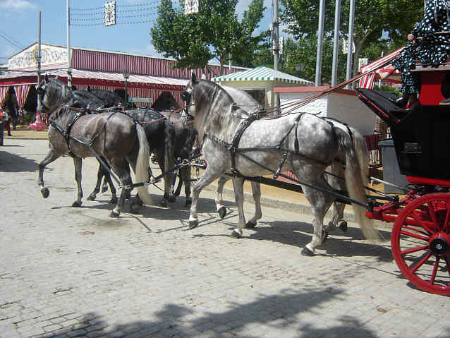 Tiraba de un coche tipo DRAG, que últimamente parece que viene en el Bimbo por la proliferación de los mismos un carruaje , absolutamente inútil e inadecuado para la Feria , pues sus ocupantes, para poder ver y ser vistos tiene que ocupa la parte superior del mismo , como en su día ocupaba la viajeros del siglo XIX y primeros año del siglo XX , pero en Inglaterra .C hocaba un poco las señoras y señoritas vestidas de flamenca y su mayoral con un sombrero de ala ancha , en este tipo de coche y con esta caracteristicas de guarniciones