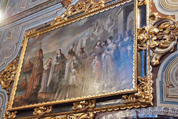 En la parte superior de los muros laterales del presbiterio vemos este impresionante cuadro obra de Domingo Martinez de 1730,tambien es obra suya las pinturas al temple que adornan la boveda y vemos en la imagen siguiente .-