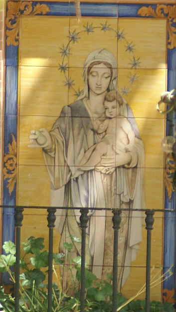Quizás menos espectacular y mas moderno el azulejo que se encuentra dentro del recoleto y encantador jardin de la parroquia , rodeados de arboles, flores y mirlos, todo un remanso de paz .-