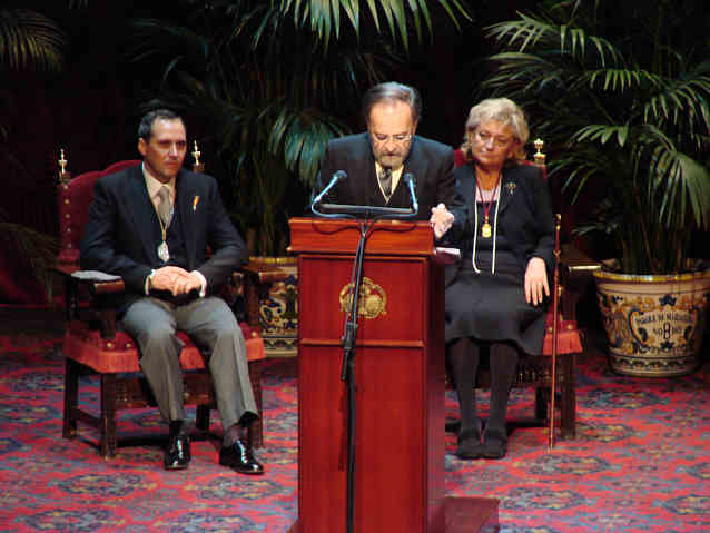9 DE MARZO DE 2008 El sueño se ha cumplido, tras muchos años de espera hoy los "hermanos" de la "Cofradía de la Columna" del maestro Burgos, lo hemos visto culminado .- Lo bueno, es que no es el primer pregón, ni el último. Antes de venir a este atril ya ha escrito varios pregones y después de este día y por muchos años vendrán muchos mas puntualmente como en cada Cuaresma. La diferencia es que hoy no lo hemos leído sino que el autor nos lo ha leído .- Como en cajón de sastre ( de casta le viene al galgo ) ha habido de todo y bueno , mucho bueno . Ha habido sal y pimienta, emoción y reivindicación ( quizás el aplauso mas atronador y largo el alegato contra el aborto, hubo dos personas del escenario que no aplaudieron este pasaje ), la gracia, la guasa, el pellizco, el recuerdo de verdad del bueno , todo ello en una faena de mas de hora y media, donde no falto hasta un espontáneo desentonado. Oles de plata de ley y estruendodosos aplausos. Oiga y si no se lo cree aquí tiene de botones varias muestras : |
