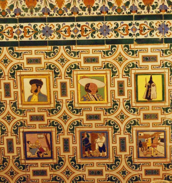 En las dependencias interiores frecuentadas por tertulias por lo general cofradieras , existen estos azulejos con nazarenos, taurinos y escenas del Quijote de una gran belleza