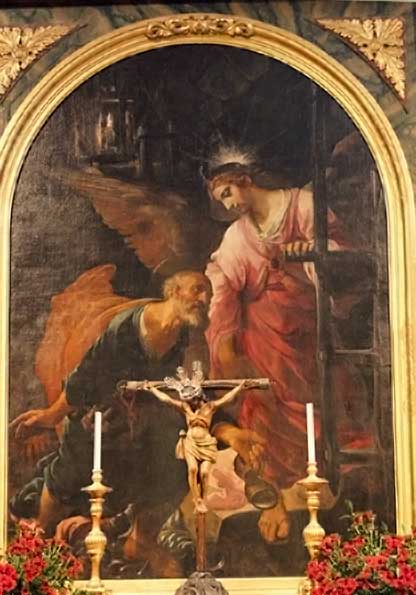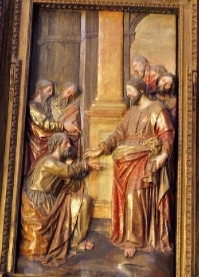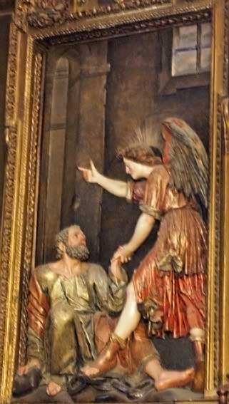 A ambos lados dos fantásticas tallas de la vida del Santo . La Liberación de la Pedro y la Entrega de las LLaves obra de Felipe de Rivas .-