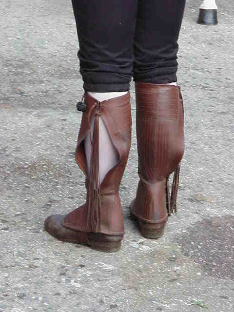 POLAINA Según nuestro DRAE : polaina. Es el calzado obligatorio , cuando no se usan zahones y se lleva solo pantalones abiertos de caireles, tanto por caballistas como cocheros y lacayos. El complemento como ven es un zapato y una media . Suelen estar rematada con flecos de cueros y algunas son tremendamente valiosas al estar profusamente bordadas con tripas de gato .-