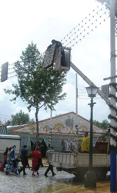 Para el próximo huracán caribeño me pido el nombre de "Feria de Sevilla", pues por lo vivido ayer , no tendria nada de extraño, hasta tal extremo que como pueden ver en las imagenes , tuvieron que ser retirado por operarios algunos adornos del alumbrado por miedo a que salieran volando por el viento ( por cierto a ver si cambiamos las maderas por plasticos ) .-