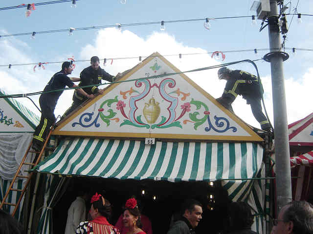 Algunos techos de caseta de lona salieron literalmente volando, por lo que fue la necesaria intervención de los bomberos ( que cosa curiosa no protestaban , ni reivindicaban por nada ) , que tuvieron que afianzarlo bien para no dejar a los sufridos socios de la meritada caseta al relente .-